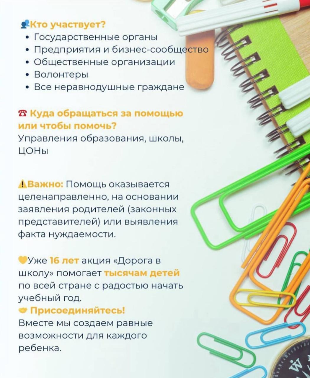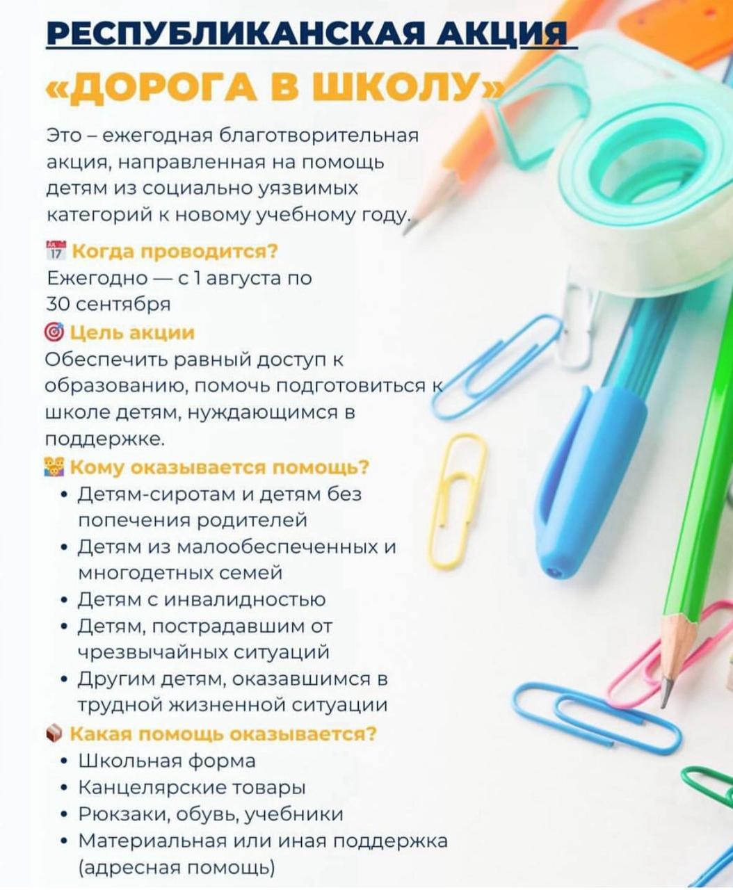 01 тамыз 2025 0 1 2 3 4 5 Акция "Дорога в школу-2025" С 1 августа по 30 сентября проходит ежегодная общереспубликанская акция "Дорога в школу". Цель акции: обеспечить равный доступ к образованию, помочь подготовиться к школе детям, нуждающимся в поддержке.
