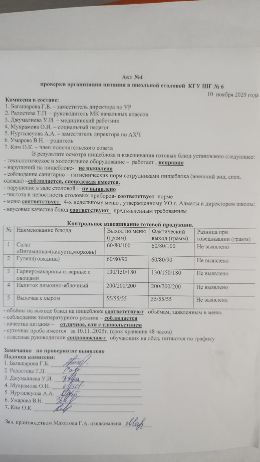 Мектеп асханасында тамақтандыруды ұйымдастыруды тексеру актісі/АКТ проверки организации питания в школьной столовой