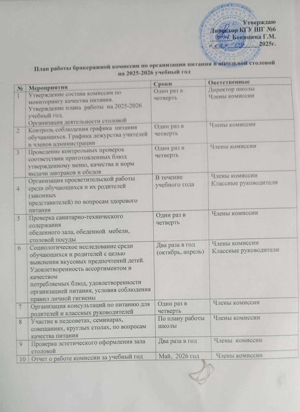 2025-2026 оқу жылында мектеп асханасында тамақтандыруды ұйымдастыру жөніндегі бракеражды комиссияның жұмыс жоспары/План работы бракеражной комиссии по организации питания в школьной столовой на 2025-2026 учебный год