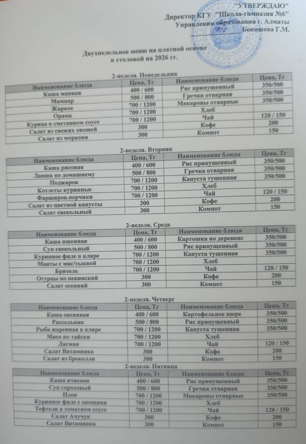 Екіапталық ақылы ас мәзірі/Двухнедельное платное меню